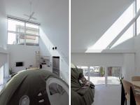 This site is like a “special valley spot of the zoning regulation”. A zoning change line (Commercial district to Housing district) is designated near the southern border line of the lot. So, the house can be built slightly higher than the neighboring one in this site. Under such surroundings, a two-story wooden house is built. The 1st floor which connects to the street for creating living space linked with lively outside, and the 2nd floor is taken a physical distance from the busy street and its floor slab is lifted higher than the neighboring eaves for taking enough sunlight into the 1st floor.