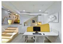 One moves down from front entrance highlighted by fixing glass roof penetrating ample light into the interior space. A raised platform has an informal conference designed by fixing multiple dia. steel pipes with an abstract panel ceiling. The flooring and walls at the front office is kept as cement finish to give emphasis on display panels. An abstract partition acts as waiting, continues on the ceiling extending into multiple abstract boxes displaying different firm’s design ideology. The lower part has open workstations connected by cantilevered wooden steps, the opening from front office looking towards the lower floor frames it. The lower part in contrast to the upper being designed in white tone. The reception table has an interesting form with backlit glass panel. A bookshelf displaying firm’s project is placed opposite to it. A green space with grass flooring and elliptical seating space is used as breakout space in the interior and used for reading books. Two workstations for senior architects are designed behind the seating.