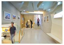 One moves down from front entrance highlighted by fixing glass roof penetrating ample light into the interior space. A raised platform has an informal conference designed by fixing multiple dia. steel pipes with an abstract panel ceiling. The flooring and walls at the front office is kept as cement finish to give emphasis on display panels. An abstract partition acts as waiting, continues on the ceiling extending into multiple abstract boxes displaying different firm’s design ideology. The lower part has open workstations connected by cantilevered wooden steps, the opening from front office looking towards the lower floor frames it. The lower part in contrast to the upper being designed in white tone. The reception table has an interesting form with backlit glass panel. A bookshelf displaying firm’s project is placed opposite to it. A green space with grass flooring and elliptical seating space is used as breakout space in the interior and used for reading books. Two workstations for senior architects are designed behind the seating.