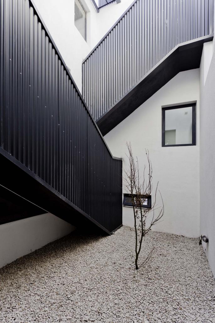 The greatest achievement of this project was to adapt under the tracks of the old building, two houses whose volumetric ambition exceeded the capacity of the land and with a simple strategy of circulatory connections, we achieved to occupy the whole site for both two houses.