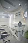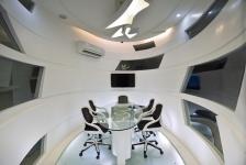 The conference room has multiple layered panels with glass slit, the form at the center acts as a transition dividing the office in public and semi-private spaces. The fluid extends to the ceiling and to the hanging light also. The conference table has been designed by combining multiple curved panels fixed together with a glass top in elliptical shape, the floor has back-lit glass floor creating an ambiance in the space. The corridor leading to the rear room has been designed with multiple project images display in black which with fluid form ceiling in abstract shape back-lit panel reflecting the pattern on the floor also. The cabin behind the conference has angled glass panels on either side to visually connect with the outer space, the glass panel are intersected by curved partition which extends from the rear room to the corridor extending to the conference room partition supporting the glass door below. The ceiling of the cabin designed in curved profile with multiple grooves has an abstract shape ceiling hanged below. The fluid and abstract form extends to the furniture designed in the space. The rear MD room has two MD table with sofa, the flooring has black tile in contrast to the grey used outside to create transition, and the ceiling has been designed in fluid form with abstract shaped black painted panel’s back-lit. The MD table has multiple glass panels fixed together with abstract shape panel.