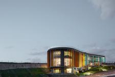 Signaling the entrance of the residential complex, the showroom displaying the mock-up apartments, is designed with its contours sitting parallel to the inclined topography. With its multi-leveled, exposed concrete structure, the free space interior of the showroom is enveloped with a repetitive vertical glass panel facade. Color is also of great importance to the design intent. The facade consists of numerous colored glass panels that wrap the showroom . Each tower facade is also wrapped with glass panels and is made up of 6 different tones of orange, green, or blue. The colors of the glass panels are the same colors used in the towers, visually connecting the showroom to the residential complex.