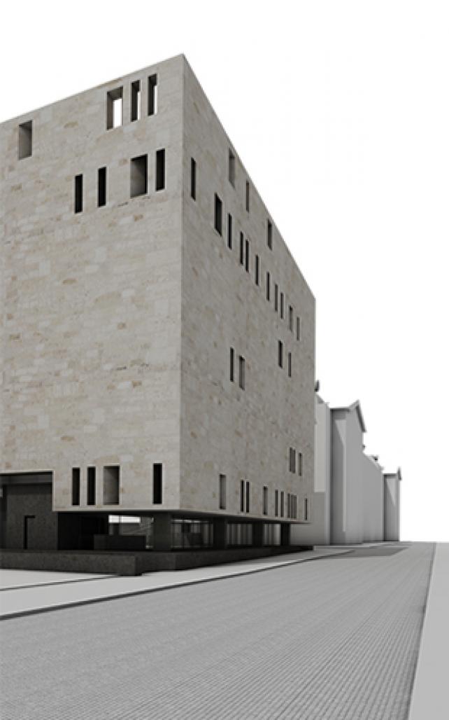 The existing building will be emptied of its internal partitions and of its staircase. Its concrete structure will be shown. The existing facade, made with precast elements, will be embedded with a new shell, giving to the Art gallery a more massive aspect. The new facade, with its appearance, seems floating above the ground floor. The stone coating and the small dimension of the splayed windows increase the introvert aspect of the building.