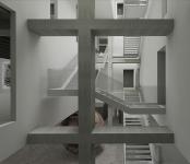 It will become the architectural structure of the new Art gallery. This space, changing its shape from expanded and horizontal to strait and vertical, rises toward the top of the building. This big void discloses, with the moving back of its walls, the construction elements (pillars and beams). In particular, the ceiling structure in concrete, now visible, will become the characteristic element of these spaces.