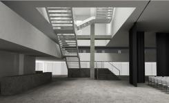 From the main foyer, after the first eleven stone steps a scenic steel staircase connects all the levels. The curvy staircase will links the wide foyer of the ground floor with the open Square (24,0m high) of the panoramic terrace. It crosses the high void in all the directions.