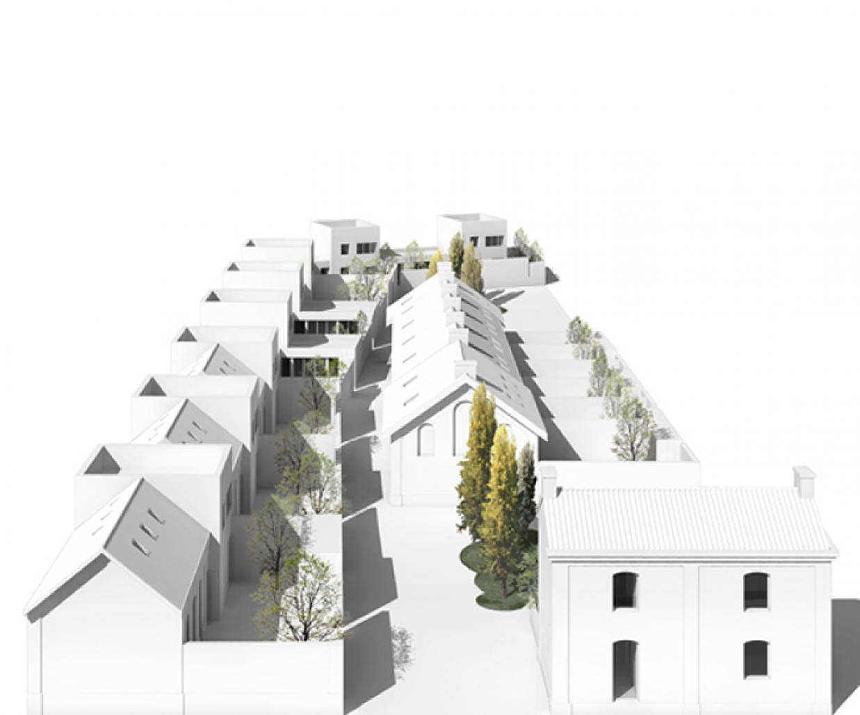 La première phase prévoit le réalisation de 5 logements à patio, à cheval entre lancien bâtiment (trois logements) et le nouveau (2logements). Lintervention veut garder et maintenir que les parties et les éléments les plus intéressants au niveau architectural de lancien abattoir. Lagrandissement du volume construit est continu avec lexistant. Le bâtiment existant sur le côté nord est prolongé par des nouvelles constructions, le bâtiment central est réhabilité et transformé en maisons mitoyennes. Lesprit du lieu est gardé dans la transformation. Aussi les matériaux utilisés sont caractéristiques du lieu, comme par exemple lutilisation de la brique pour le revêtement des façades. Lintervention transforme lexistant en un nouveau organisme. Ceci, avec son aspect homogène, reste toutefois lisible et garde la mémoire et lhistoire du lieu.