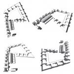 Les logements à patio (huit) ferment tout le côté nord et est du site. Lancien bâtiment sagrandit tout le long de la limite de la parcelle à travers des nouveaux éléments verticaux, des “tourelles”, qui idéntifient le rythme des logements. Celles-ci permettent, au fur et à mesure de leur variation, de créer les logements les plus généreux.