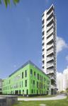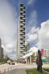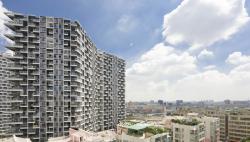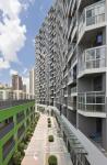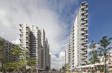 The “central park”is screened off from the noise of the city by the housing blocks which are all elevated on stilts to guarantee the continuity of landscape and car parking space. The design of housing blocks allows people to enjoy a variety of interfaces like loggias, balconies and bay windows, with open air in a high-rise situation. The colors sprinkled on the exterior breaks the homogeneity of the facade by creating a visual rhythm for the development. With such façade strategy, tenants can personalize their own interiors while the building façade can be kept organized and coherent. Aluminum fins guarantee a lasting color effect with zero maintenance cost.