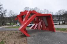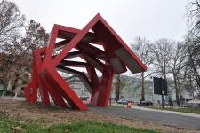 Its an open, clear and structurally dynamic form in a contrasting red color that explores the possibility of motion in the environment, in witch this kind of exploration is needed; at the same time the movement itself is present as a natural environmental process. The idea represents a blooming of a frame though five different phases, a somewhat Calderian approach. This dynamic sculpture with its form stimulates interest by pedestrians and invites them to pass trough.
