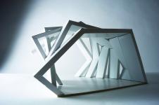 Sculpture is made out of five strips, that are 1m wide and are made out of steel beams. Whole sculpture is covered with modular facade system. Some surfaces on inner side ware left empty and function as a lightning surfaces, that underline the overall concept. Lights are automatised and are turd on or of with other lights in park. Fundations are made out of tree 2 m wide concrete plates. Overall size of sculpture is 5 x 5x 5 m.