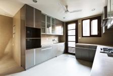 This strategy helps bring light deep into what is essentially, a narrow thin building. To further add to the luminosity of the interior spaces, two light wells are placed in the main living space. Equipped with operable windows, they not only bring light, but also draw out air from the floors and vent from the terrace. The deep recesses for the windows and large overhangs temper the fierce climate of Delhi and recall sustainable building traditions, while allowing for views from within. Two local stones, one grey (cudappah), the other sandy brown (jaisalmer teak), are used to emphasize the cubic volumes that give this house its name and form its most distinctive visible element.