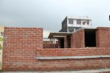 The flooring is Kota, the walls are in brick, and the 2 concrete slabs define the horizontals – the lower one acting as both the foundation and the floor.