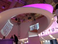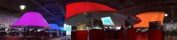 During the eight month long group design and production period, the cone-like structures were formed through a design matrix in which they were separated based on shape, category, and function. These cone-like structures not only created a visual but also a structural transformation to the interior with their size, shape, and color. With the help of Naveen Mehling of Compact Promotion, the lighting design of these structures consisted of a three layers of stretched PVC membrane and RGB LED lights. Not only did the exterior of the cone-like structures provide visual excitement, but the interiors were also used as display spaces for moving digital projections. The large glowing floating structures create a sense of curiosity and invite visitors to come closer and discover what is inside. With the colorful cone-like structures suspended in mid-air and the “product wall” hanging 3.5 meters off the ground the visitor’s visual field is never obstructed, supporting the ‘360 degree line of sight concept’ allowing the visitor to enjoy the exhibition from every angle and in its entirety.