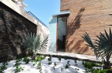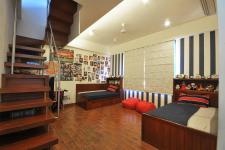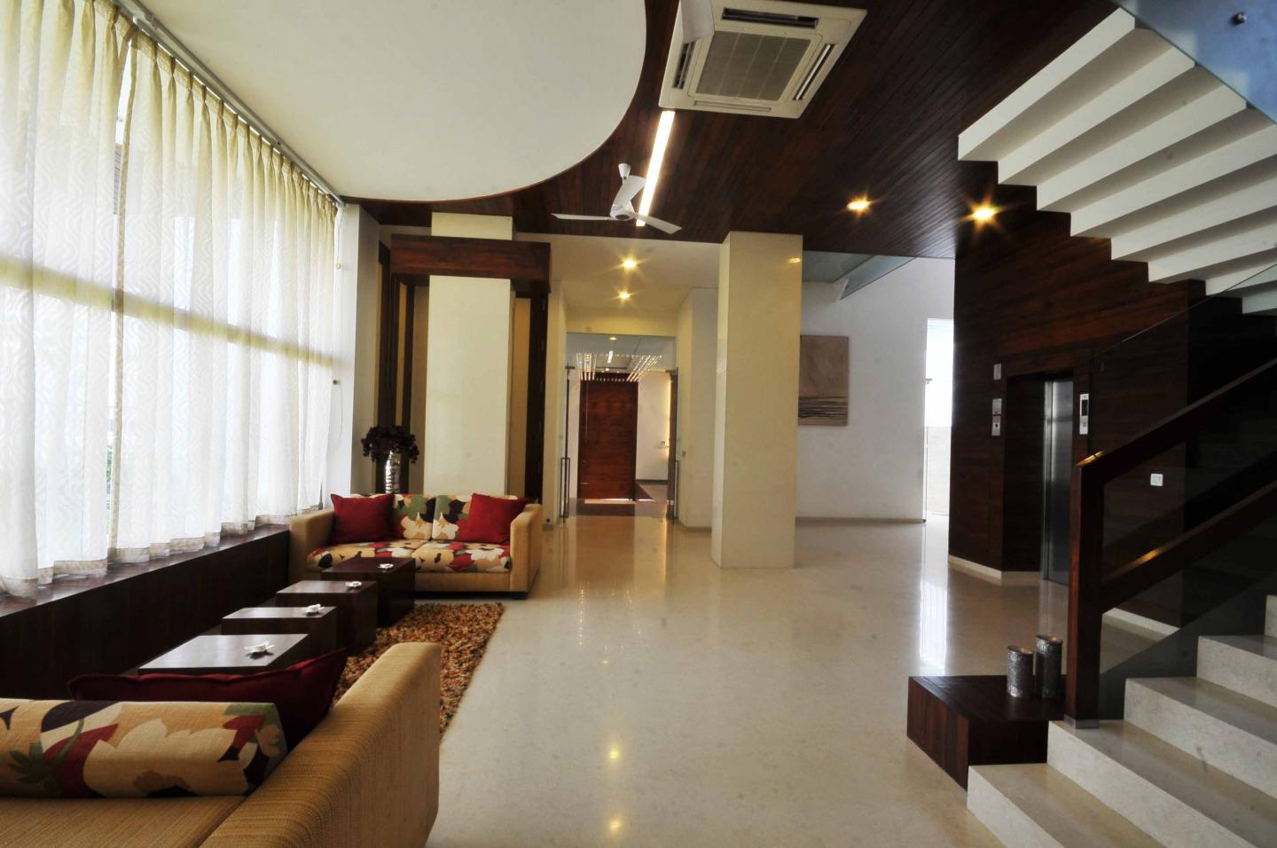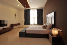 The route is designed as a story that unfolds dramatically. Ramping up and along the blank façade to a sixteen foot high door, then through a top-lit long and narrow passage, one arrives into the double height entrance foyer with a gloating glass bridge. Moving ahead, one comes to the family living and dining areas. The house builds itself into an introverted theme, which converges into the central courtyard. A story unfolds with each new space in the house. Stylish bathrooms fitted into elongated parallel spaces with black and white design board. Elegant bedrooms spaces with huge spatial dimensions, punctuated with designer Italian furniture. An attached study/ entertainment room is built-in with a cozy, comfortable environment that is augmented by dark wood flooring.