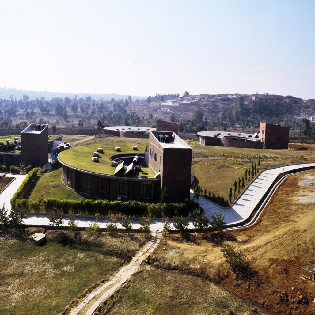 The site is a 42-acre plot of undulating land amidst valleys, far from the city pollute. The bare palette is given an overall master concept of a larger campus with school, colleges and residential facilities to form an institutional hub. Being planned as a narrative, different parts of the institute appear as a layered script that make walking through the campus an interesting process of discovering spaces and functions. The campus is punctuated with facilities and built forms that are efficiently positioned to capsulate scaled spaces. An attempt is made to imbibe a philosophy of liberating the mind.