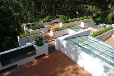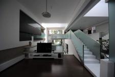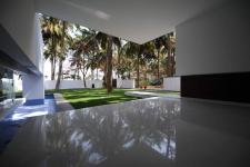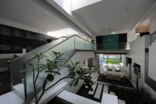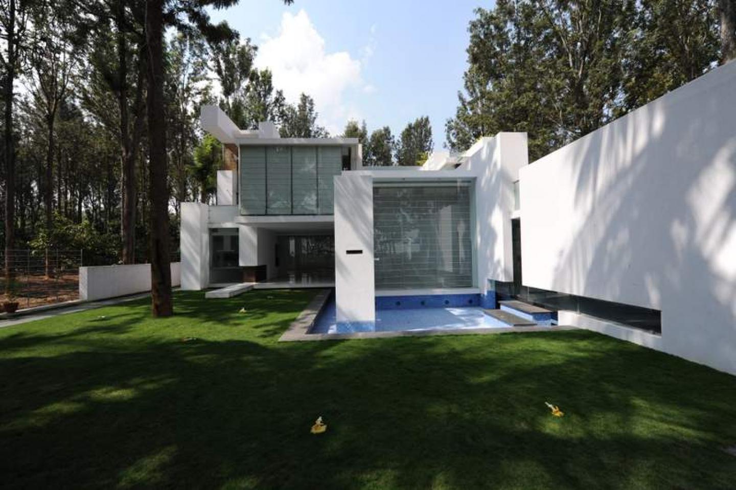 The residence is a complete RCC frame structure with teak wood work marking the interiors. The main highlight being the front and rear side of the building completed with clear glass capturing the siver oaks tree view. The interior was completely conceived as a white space, which lead to the use of materials like white marble for the flooring and storage shutters made of white corian with the only contrasting features of inner and external greens capes.