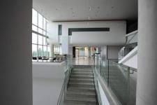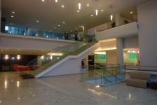 The reception table in both the levels is designed as a continous peeled form. In the ground floor, the table forms a continous curved surface of black granite which extends to the exterior as the security table. The first floor reception table is designed like a peeling form off the floor surface. The flooring material which is granite is continued on this curved surface so that it looks homogeneous. The other curved surface above is finished with wenge laminate.
