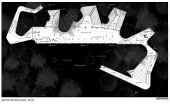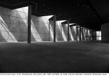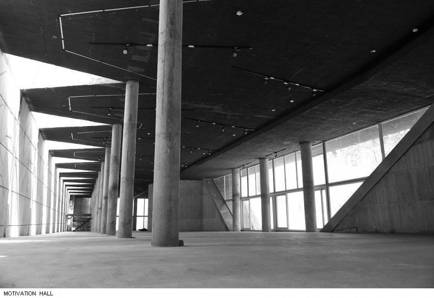 The Entrance to the motivation hall through a large open court 1 with amphitheatre like steps is the first of 5 courts that serve to provide ventilation and daylight into the underground structure. In addition to the open courts, triangular skylights animate the space through the day. The hall feels almost like a concrete bunker with the raw finishes of exposed concrete.