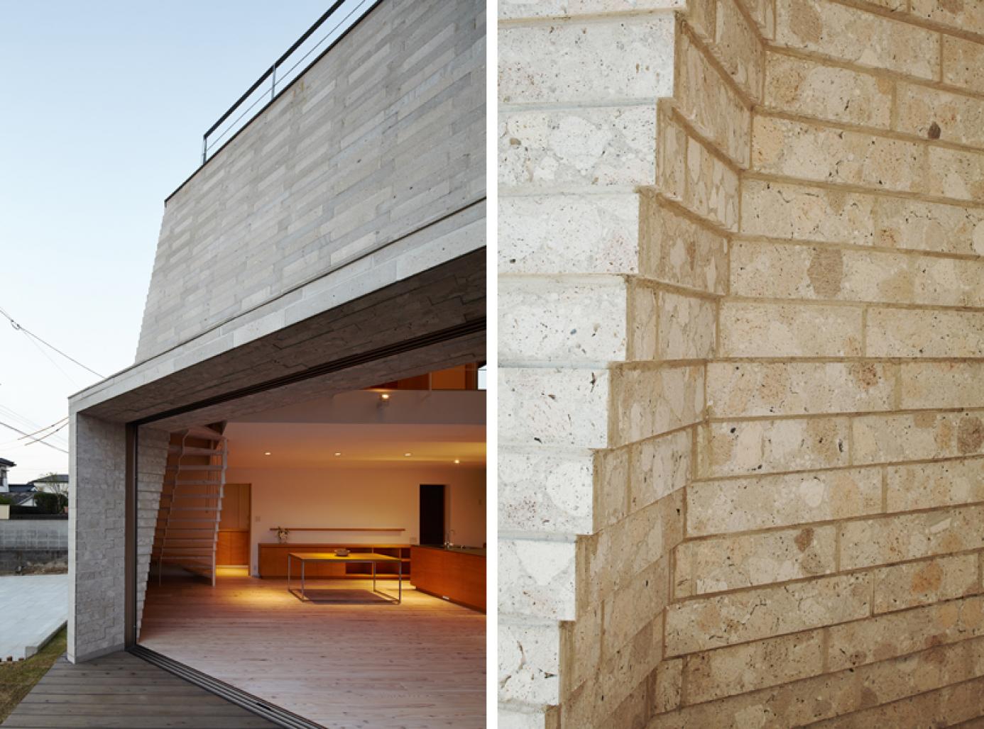 Shirasu has a lot of characteristics in other geological features like fireproof, adiabaticity, the humidity conditioning, thermal storage, and lightness, etc. without. Pressurizing and construction it the technology of a monotonous block in Shirasu for the pavement that had begun to spread in the city was made the best use of, and production with the block for the construction of Shirasu was tried for the first time. To secure material strength, the outside wall block changed mixing Shirasu. It inlaid with the raw ore of Shirasu to improve the adsorption and desorption of moisture to the inner wall block. At the same time, The character of this Shirasu appears as an expression of the memory accumulating to the block. The house where in all outer had been piled up on an inside and outside midair layer double wall became a space wrapped in the soil like the cave in Shirasu.