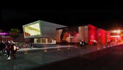 The square has been organized with an open-air venue used for life performances as well as programmed open digital LED cinema surrounded by pedestrian and green areas. The visitor is lead through the promenade plaza with trees and dancing fountains to the glass main entrance under a concrete floating volume. A key element in the design for the elegant facade of the National Cultural Center was the creation of a low-rise structure in the quarter, while at the same time providing a strong sculptural volumetric impact to the city with sun & shadows during day and color spotlights during night.