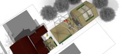 The creation of a courtyard between the old and new buildings is part of the plan for the center, acting as a piazza-inspired gathering point for recreational and cultural activities for the whole community. The piazza will include the striking, multifunctional architectural feature of a rotating steel frame connected to the new building within a triangular shaped light structure that can be used as a support for a film screen, as well art installations or banners. Staged performance events, such as dance or theater works, can utilize the frame as sort of sculptural, abstract proscenium. The paving of the square adjacent the building is divided into five, inclined triangular sections designed to integrate raised bed planters for vegetable and herb gardens. It can be occasionally covered with a lid surface to accommodate audience members during events or just for weather protection. It will also channel and collect rainwater in an underground water tank -- water which can serve the whole center and irrigate the garden.