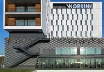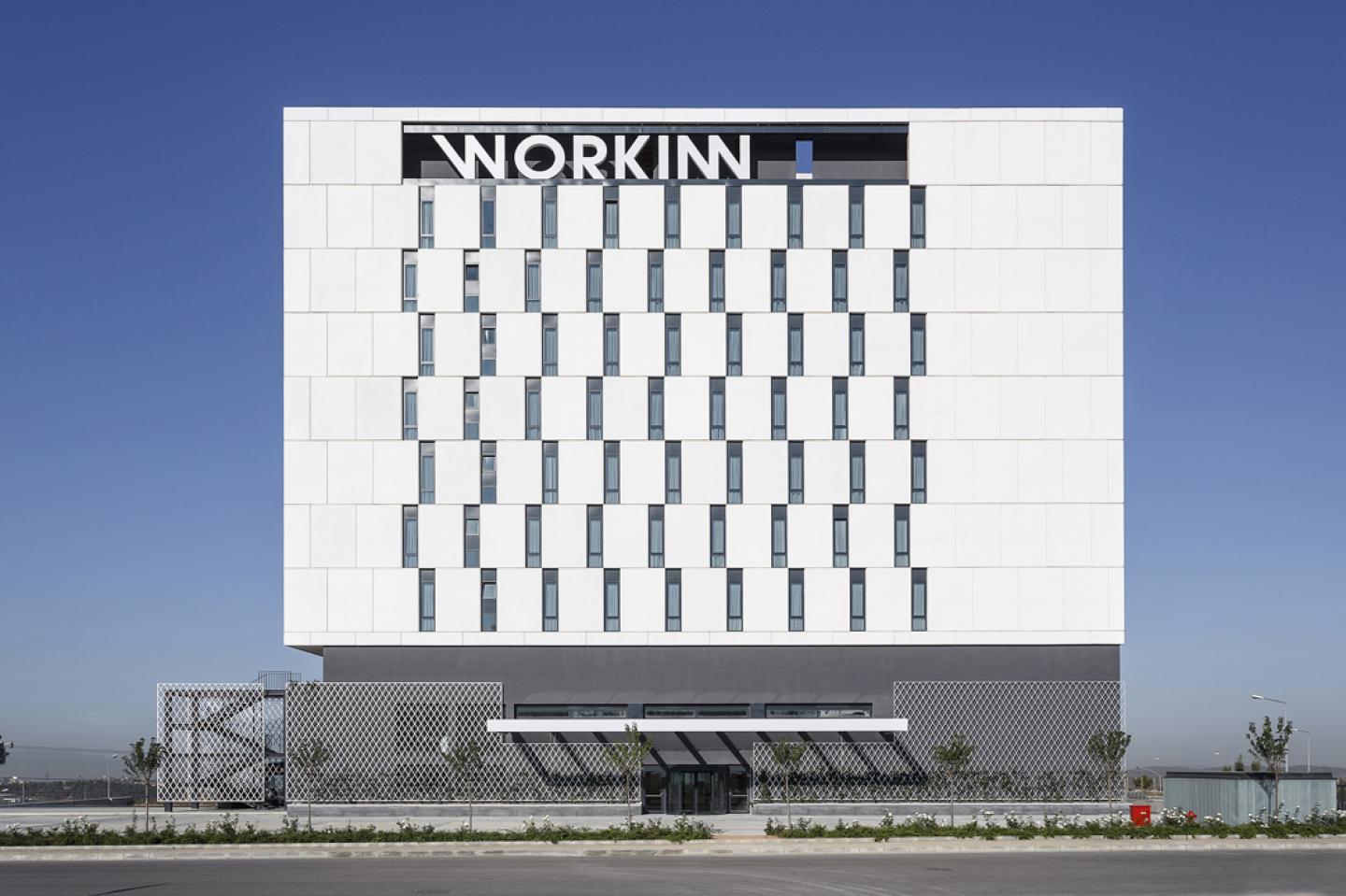 Designed by Çinici Architects / Can Çinici, Workinn is the first hip hotel in Gebze, located within TAYSAD organized industrial site (TOSB) at the outskirts of Istanbul in a recently established suburban center ‘Cayirova’. The 162 bed hotel utilizing 12 000 m2 closed area, resides nearby a busy traffic interchange connecting the campus with a transeauropean motorway. Being so close to roadways thus creating the atmosphere of a stopover hotel helps in keeping memory of a temporary accommodation alive. The hotel is commissioned and managed by Uyar Group.
