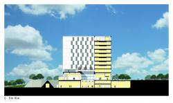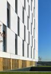 Tectonically the building is divided into two main parts; ‘The base’- 2 storey high accommodating the lobby, bar, restaurant and meeting rooms, and the ‘white mass on top’ - comprising three different types of rooms - standard rooms, executive rooms, studio flats. The distinguishing tectonic character of the L-shaped white mass in plan is its facade built out of giant prefabricated concrete panels where the windows are treated merely as intervals in between.