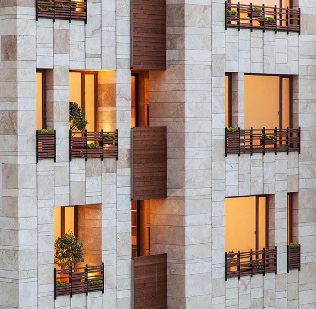 account in the designing process of “Baranoosh” project. Creating a dynamic facade in an orderly fashion was the key factor in the façade of this building. The geometry based on which the general concept of the façade was formed has been exposed in the details of the stone works and the plants has appeared in the preplanned spaces on the façade.