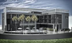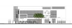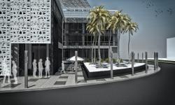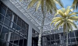 the building has a relatively big landscaped area partially covered with the building structure that shades the curtain wall and palm trees, introducing a cool environment on the building entrance.