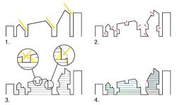 Entry for Badel block urban intervention competition in Zagreb, Croatia. The new structure is based on a simple grid that evolves from the old Distillery building. By opening up the block and making it accessible, people can use the whole block making it into a city within the city. This creates urban rooms where people stay, meet and stroll.
