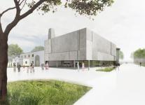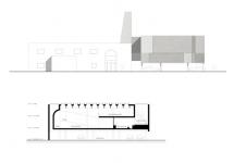 The extension is made as a light weight construction using metal framing and metal columns. The facades are coated with prefabricated concrete boards set on different distances to create a 3-dimensional surface.