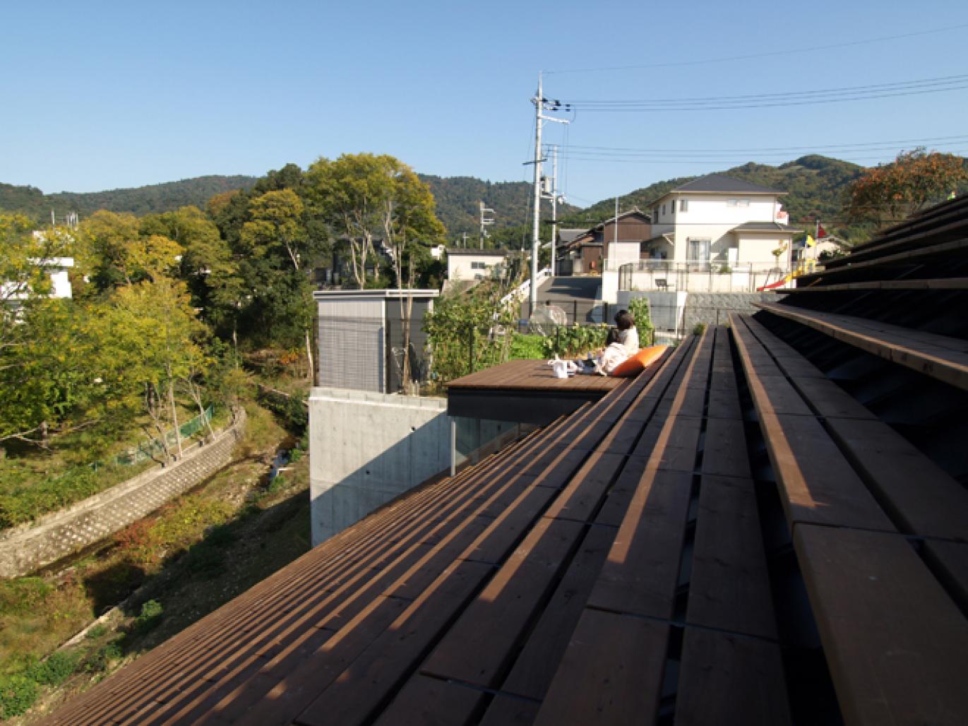 We designed stairs-shaped roof that is down to the riverside. On the roof our client can enjoy watching the fireflies, deer and color leaves. From the roof we can enjoy scenery of Mt. Wakakusa and Mt. Ikoma. So that people can watch some traditional spectacular events of the mountains such as “Daimonjiyaki” bonfire in summer and “Wakakusa-yama Yamayaki” (mountain burning) in new year’s days.