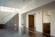 The composition of two slender boxes sandwiching the corridor makes long distance like a labyrinth in the simple house. Therefore people are easily able to make distance for their privacy.
