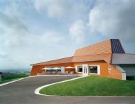 exterior spaces. The two-dimensional, dark-orange wall encloses the public forecourt – the main entrance to the building - like