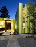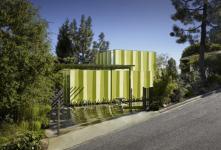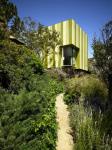 Viewed from the street the building presents a solid, uninterrupted wall and play of massing, while from the yard it reveals itself as a subtle garden feature. The double-skin system’s painted cement panels with deep reveal joints wrap the structure, and reference the color and movement of the canyon grasses with a bold and whimsical graphic pattern. More than simply an object in the landscape, the retreat is a sculptural folly that engages its natural surroundings.