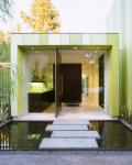 Dividing the program into two pure volumes, a tall dominant cube that houses the retreat space and low parallel rectangle with the living areas, the balance between proportion and procession creates distinct, comfortable spaces that belie the minimal 855-square floor plan. At the threshold, four granite stepping-stones, which seem to float in a pond, mediate the transition between the landscape and the building. The entry establishes a play of solid and transparent planes via a wooden door set in the center of a clear glass wall.