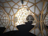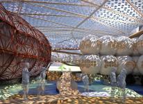 filtering wetlands on the exterior and interior of the buildings. The building uses wood from locally managed