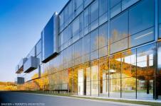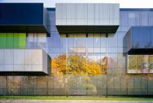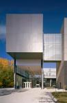 Like the bark of the London Plane trees conserved on the site, the layers of landscape detach and lift, establishing a new topography from which grow both the building and its garden landscape. Nestled into this landscape are the building`s `mineral` public functions {Multi-Media Studio Theatre, the E-Gallery and the Image Bar}, each with its own identity yet tied together by the new terrain. Continuous, interwoven strands of this topography lift and wind vertically through the structure, connecting spaces between the shifting program elements, which puncture the vertical façade membrane at its upper levels. This in-between space, occupied by platforms, bridges, stairs and ramps, fosters openness and interaction between the occupants, program and the outside environment, each allowed to flow through the envelope by means of the shifting solids. Fluid public space is thereby created, reinforcing the uniqueness of the campus. - Saucier + Perrotte Architectes