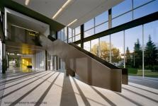The glazed vertical surface of this connection acts as a thickened membrane which becomes a technological filter between the existing, natural material of the forest and the tamed, controlled environment of the building and its garden. At the level of the ground, the membrane is completely transparent; the line between exterior and interior disappears. The earth plane forms a continuous public room that slips into the building, flows through it toward the courtyard, onto the landscaped roof of the garage and into the campus beyond.