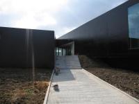A building formed from two separate volumes built on a sloped site. One of the volumes is used as work spaces while the other contains a workshop, exhibition space and storage areas.