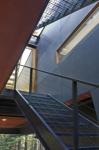 The house rests in the middle of nature, but does all it can to avoid disturbing it. There is no yard; cutting of trees was reduced to an absolute minimum. There is no drive and the approach to the house is through the woods on foot. The entrance is an open courtyard, leading from beneath the cantilever, directly up into the core of the house, and thence to the roof-deck and the sky.
