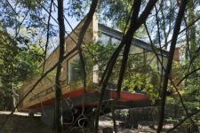 The house is conceived as a weekend retreat from the stress of Manhattan. The ten-acre site in Ulster County, some 100 miles north of the City, is densely wooded with views to the Catskills. The design takes advantage of the terrain’s heavily wooded and sloping by cantilevering into the treetops and towards the view, anchored to the ground at the sleeping quarters and hovering in the trees in the living areas.