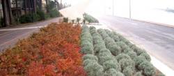The features of this landscape are consolidated by REFORESTATION of the pinewood and by some native and resistant plants as the "Yuccas" { sword-shaped leaves and large terminal clusters of WHITE flowers, "Spireas" {with ORANGE-YELLOW small flowers} and "Lavandulas" {named `Blue Cushion`, characterized by its dwarf compact habit, profuse blooming in early June continuing into late summer, upstanding flower spikes appearing well above the foliage, and its deep blue flowers which fade first to pale BLUE and then to GREY, giving a distinctive bicolor effect}