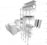 The construction details emphasize the lightness of the structure. A steel plate, which is embedded in the pre-cast concrete beam, connects to both the lower and upper bamboo twin-column as well as the bamboo tie beams. While this steel plate cuts through the bamboo column to make use of reverse bending, the continuity of the bamboo columns is maintained accentuating the verticality of the structure.