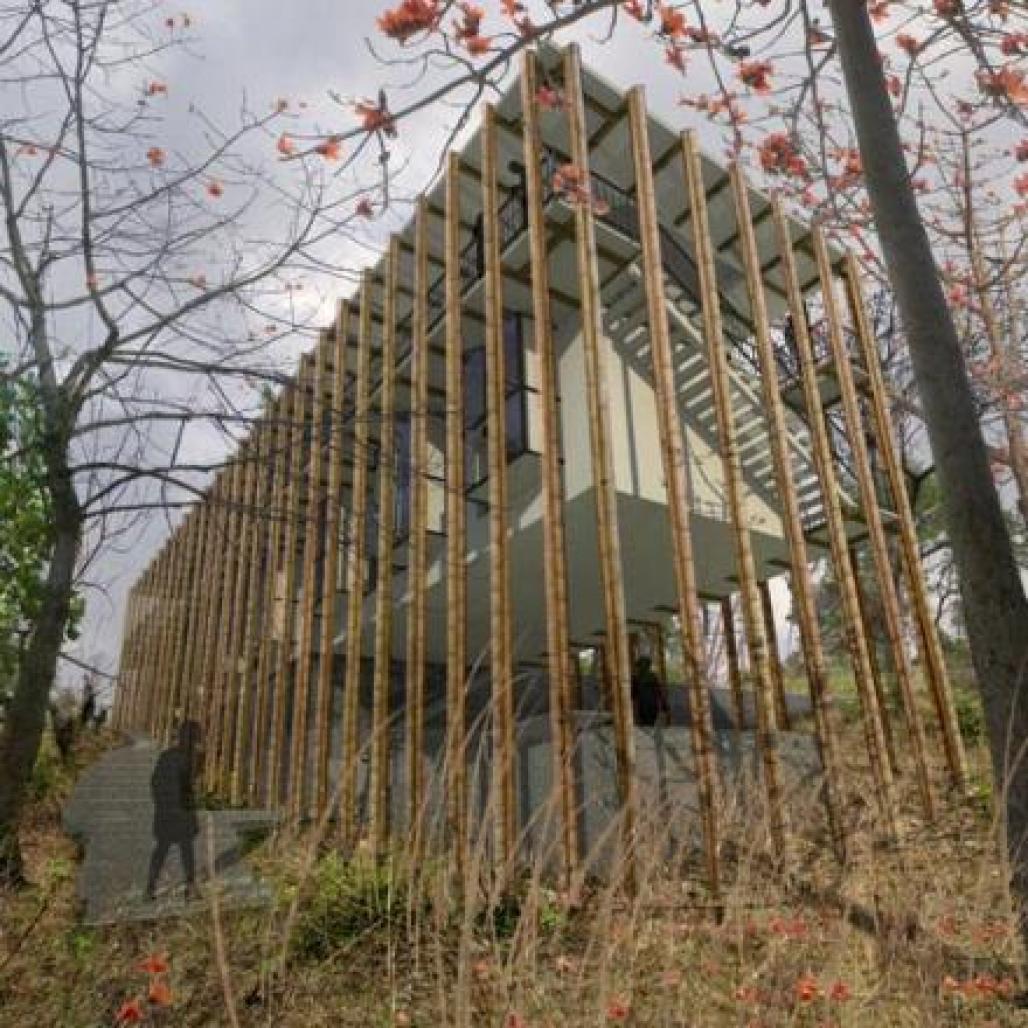 A ‘cage’ of bamboo columns wraps around the building. Public circulation and verandahs occupy the interstitial spaces between the external bamboo columns and the internal mass. The large covered verandahs and the relatively narrow width of the building envelope allow for comfortably ventilated and shaded semi-indoor spaces. The bamboo enclosure creates a dialogue between the interior and the dramatically changing landscape. The natural landscape changes from a dense brightly green coloured jungle-like forest during the monsoon months to a pale brown shrubby wasteland during the dry and hot summer months. The building has to respond to these extreme conditions by allowing enough shade and breeze during the summer and providing a waterproof indoor environment during the stormy monsoons. The screen of columns creates an ever-changing pattern of light and shadow throughout the seasons and times of the day, making the building a ‘sensor’ of light.