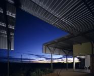 located in the Great Sandy Desert. The building is a simple cluster of pavilions under a large parasol roof