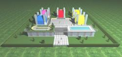 Finally, an explanation that there are two ground-floor structures {7×14 m at the base each} in the entrance to the complex area. On the roof of one there is a pool, on the roof of the second a garden with benches where people can leisurely sit and chat! Below the pool is a restaurant, and below the garden a space for seminars and weddings, with small niches for a boutique, a drugstore, flower shop, a travel agency counter. A passarella bridge connects the pool with the garden.