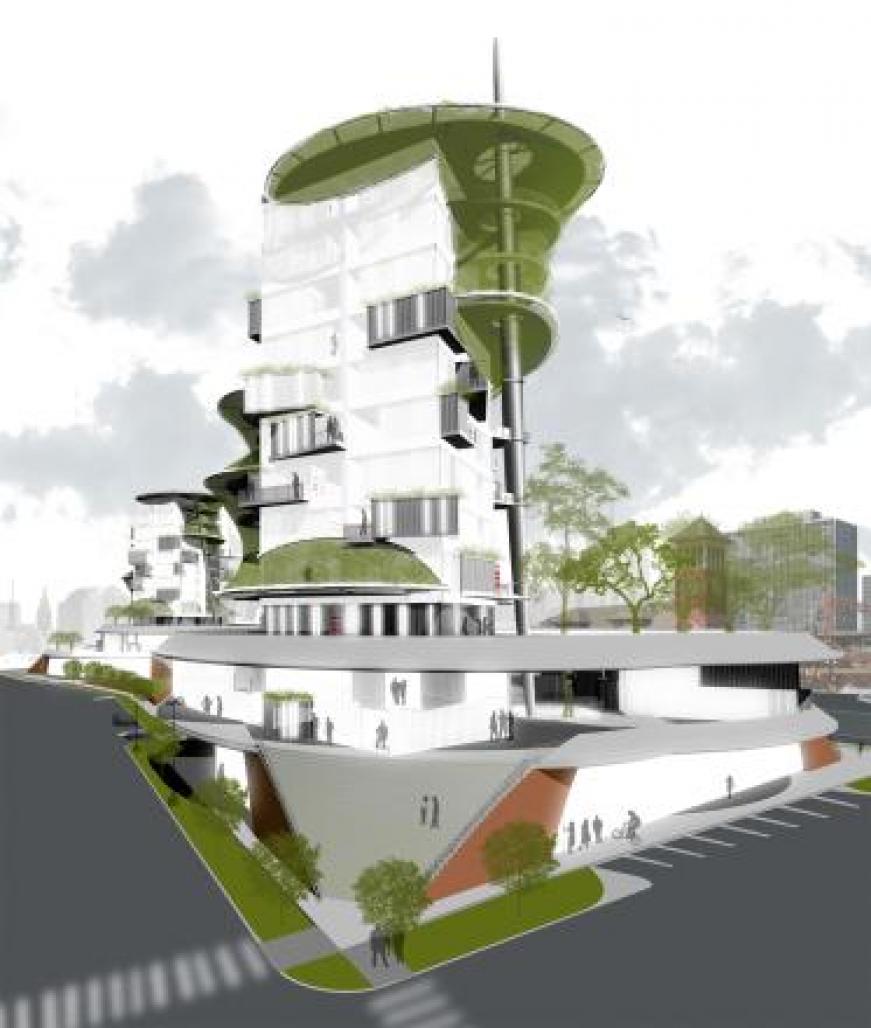 This project reuses shipping containters for multiuse tranist oriented development. The inspiration for this project came from the exploration of instances of the intersection between the natural and the man made. Such as a trees roots affecting a sidewalk and visa versa. This in effect is ment to parallel the conceptual and physical transition of the container to post industrial urban development. This came through formally in the project with the "organic cable structure that intersects the tower facades and creates the sky gardens in the space between.