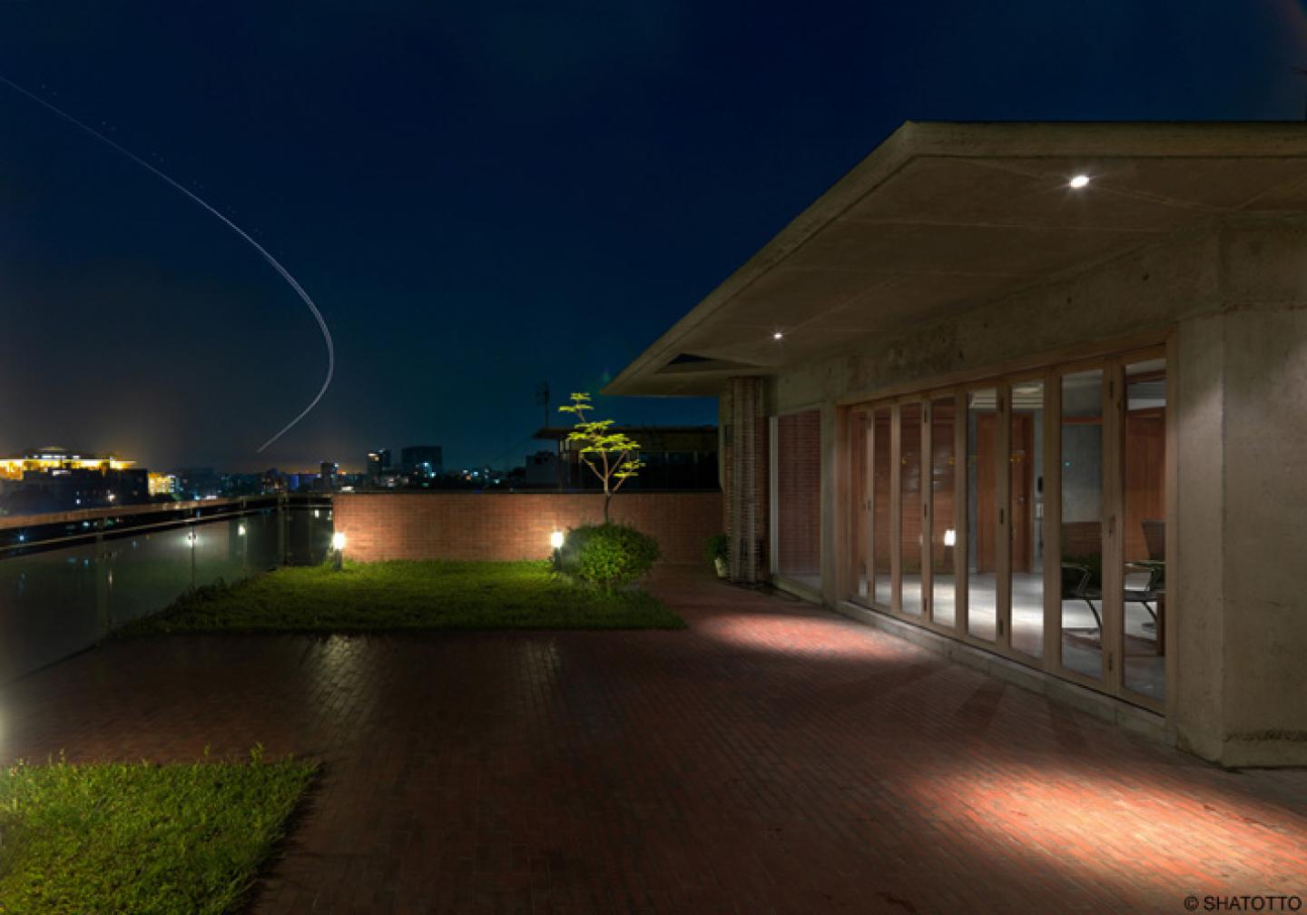 Basically, these two buildings developed almost similarly consisted of five apartments on ground floor and parking area. In plan, the simple interior with required functional arrangements connects with the beautiful lake and large trees on the west, allowing the south east summer breeze to go through the entire house with ample light round the day. The use of exposed as cast structural beam and column exterior with terracotta brick in fill is also a simple approach friendly to the subtropical climate of Dhaka. Outside no boundary wall notion and little benches are a token of respect for the passer by and community living around.