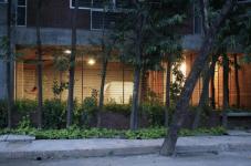 In plan every apartment has large family space along with formal space connected and divided by small courtyard with garden and water in between. The leaning western sun is used for growing plants. The twenty five feet long window of family cum dining space is designed to connect the green field and setting sun through the screen of the existing green trees up to third floor. Above the tree screen at fourth and fifth floors the same window has been pushed back inside further with hanging gardens in order to create more shaded interior and a screen against the afternoon sun.